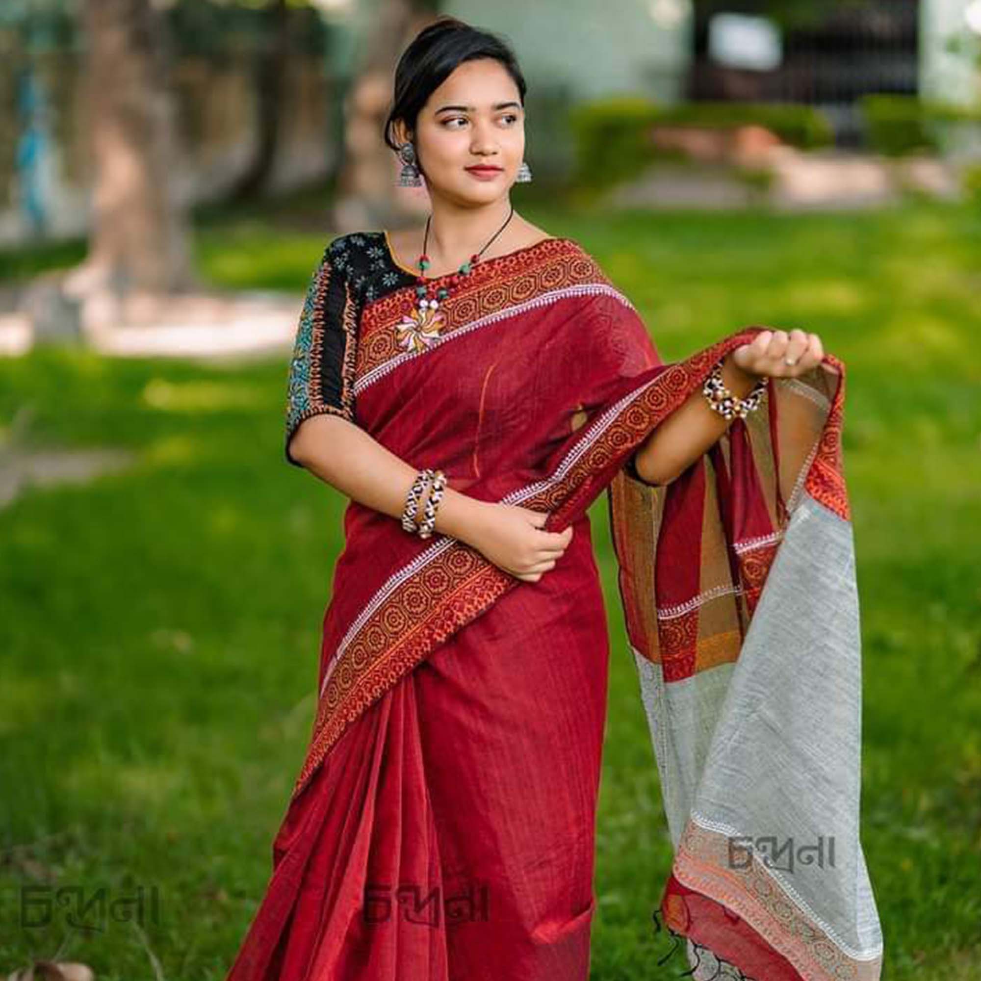 মেরুন ব্লগপ্রিন্ট শাড়ি – পিওর কটন ব্লকপ্রিন্ট শাড়ি