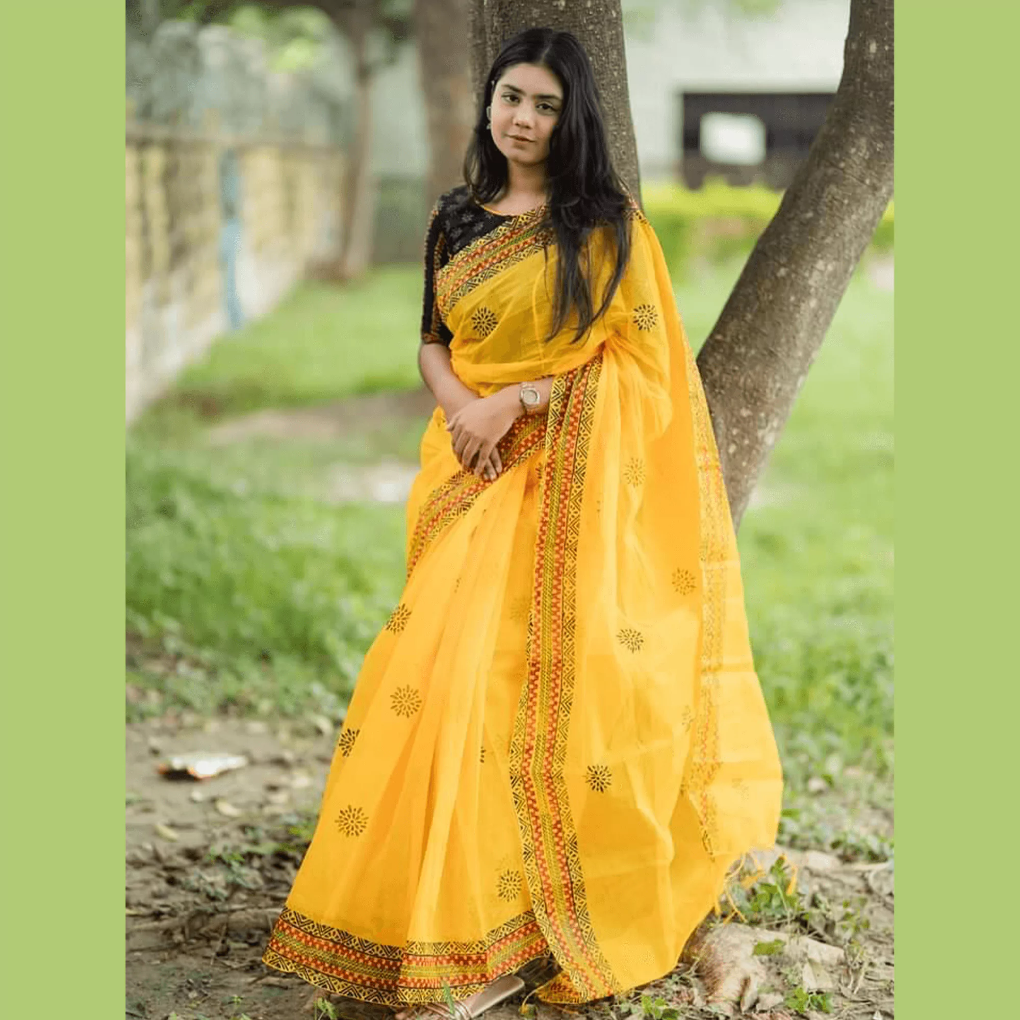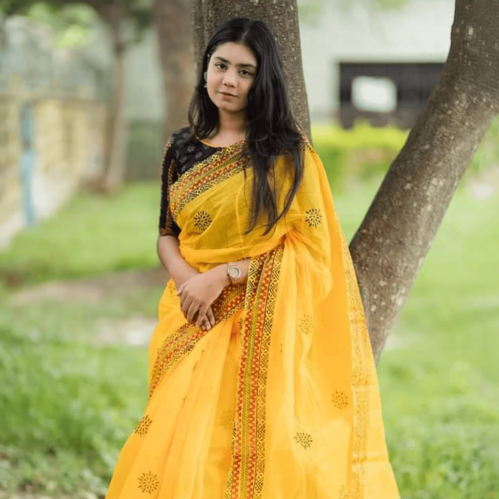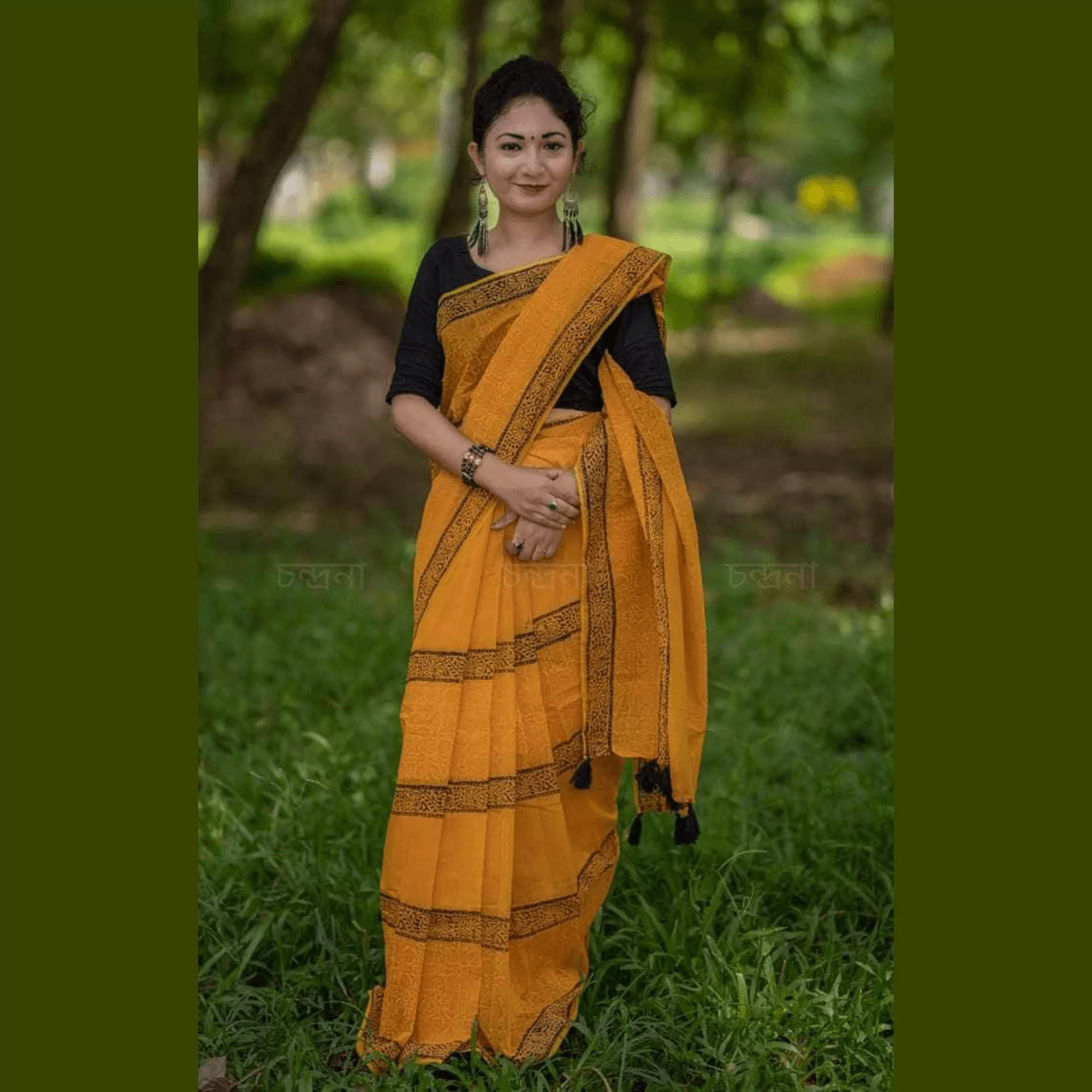 হলুদ ব্লকপ্রিন্ট শাড়ি – প্রিমিয়াম ১০০% পিওর সুতি ১৪ হাতের কটন শাড়ি